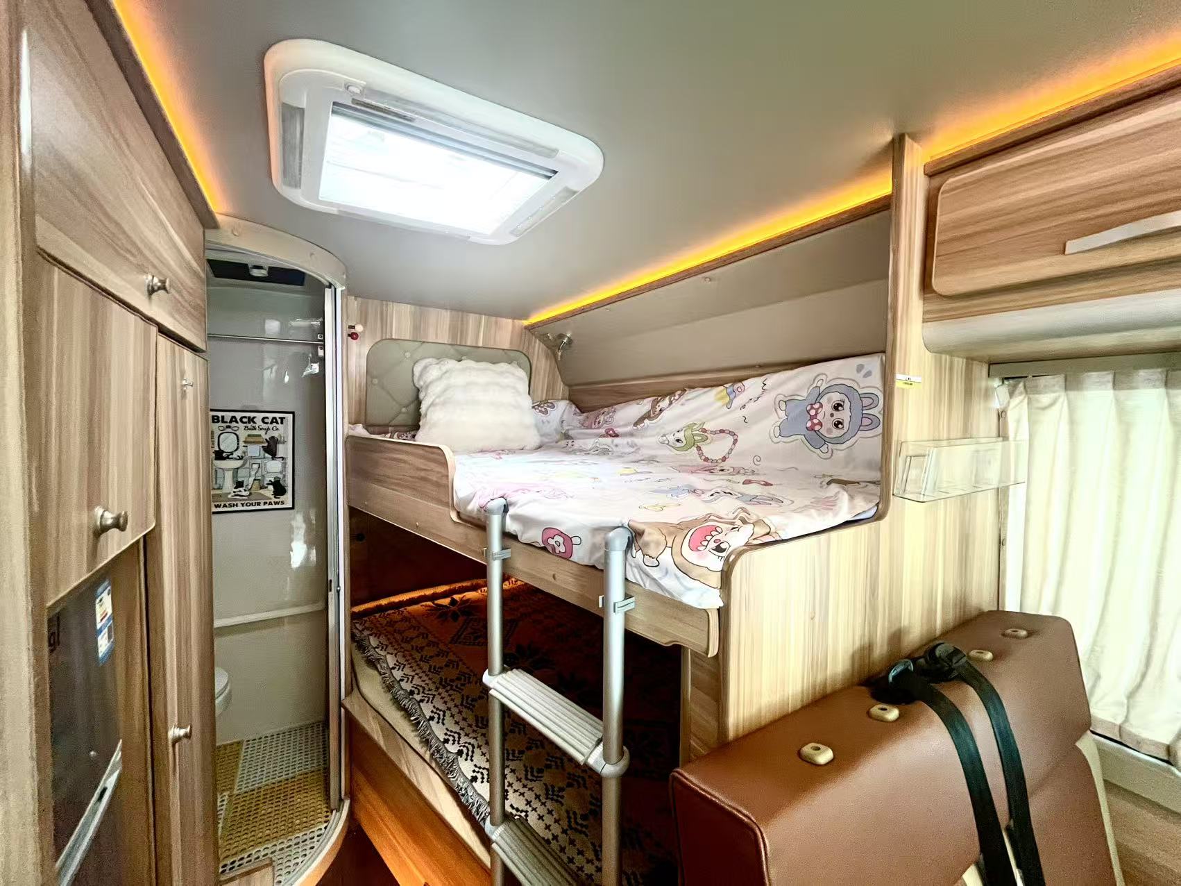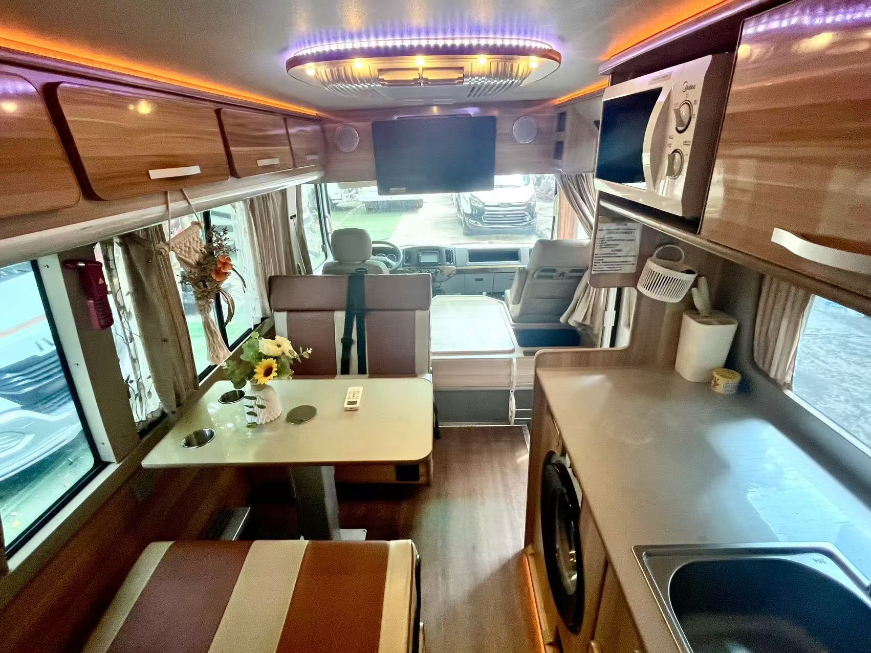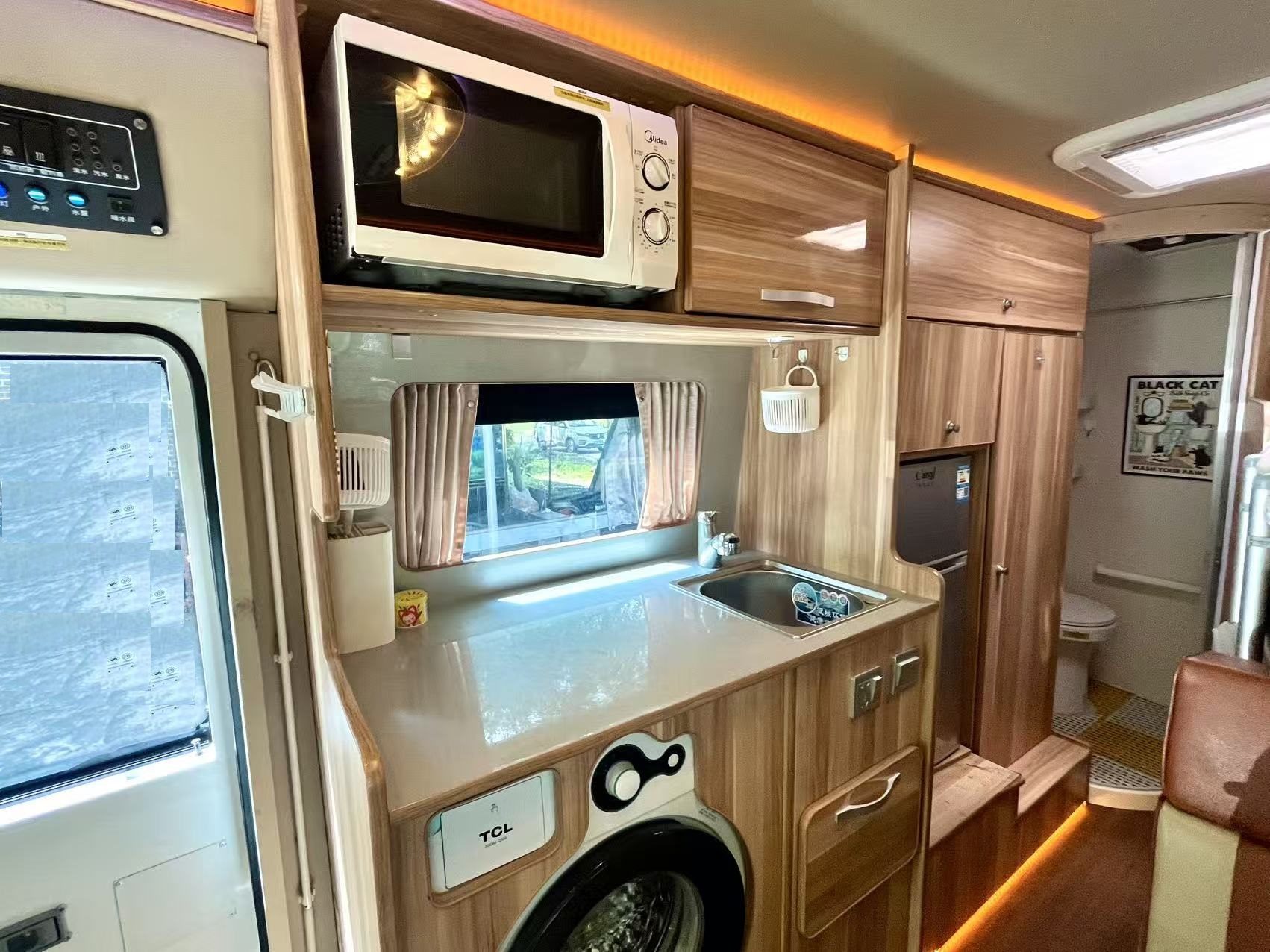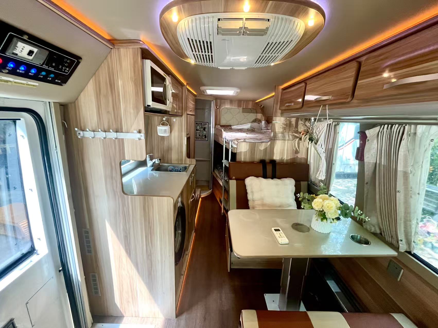 水电配置:12伏600锂电池,7.2度电,300瓦太阳能,3000W逆变器,160L清水箱,50L灰水箱;